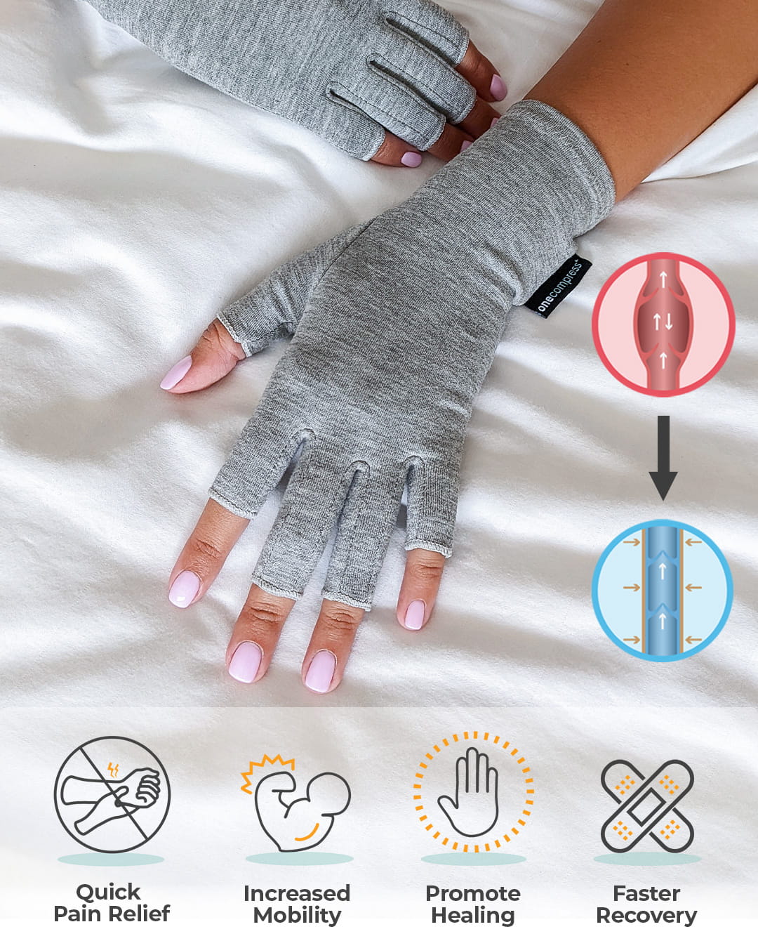 La compresión ligera de ArtiGloves estimula el flujo sanguíneo en manos y dedos, ayudando a reducir la hinchazón y el dolor asociados a la artritis. Esto mantiene las articulaciones nutridas, mejora la flexibilidad y previene la rigidez a lo largo del día.